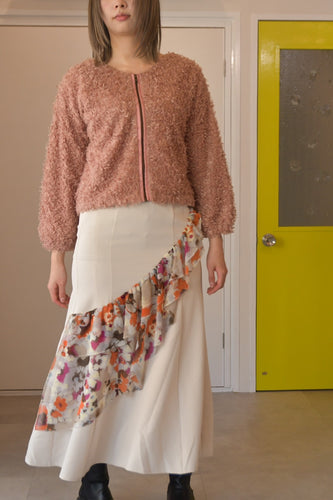 シンプルなスカートに異素材合わせのほど良い存在感で、
