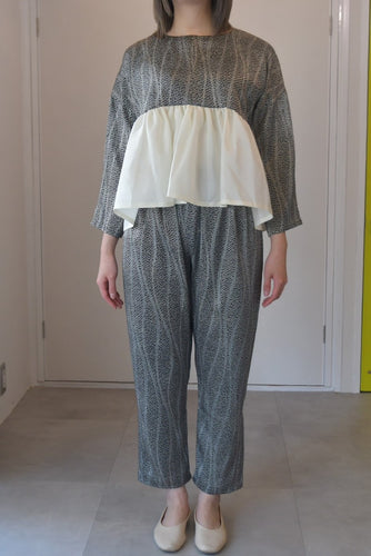 白のレースをポイントにした着物からリメイクした上下セットアップです。