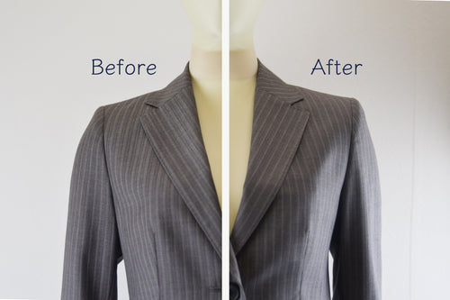 肩パットを入れる作業です。パットを入れることで肩先に立体感が生まれます。